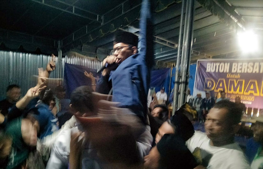 Alimudin Baedu diangkat beramai-ramai oleh warga Buton laki-laki dan perempuan saat kampanye bersama warga Buton di Teluk Bintuni bertajuk “Buton Bersatu untuk DAMAI” pada Minggu (13/10/2024) malam. (angleng ken/aspirasipapua.id)