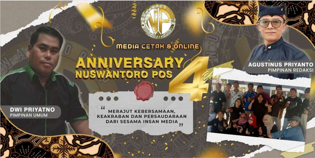 Saya bersyukur dan terima kasih atas terselengarahnya anniversary 4 tahun media online dan cetak nuswantoro pos semoga dengan bertambahnya usia media ini akan semakin dewasa dan maju. Serta dapat lebih banyak mencetak wartawan wartawan muda yang handal dan profesional, sekali lagi saya ucapkan selamat anniversary ke.4 tahun media online dan cetak Nuswantoropos.com tetap jaya dan sukses selalu.