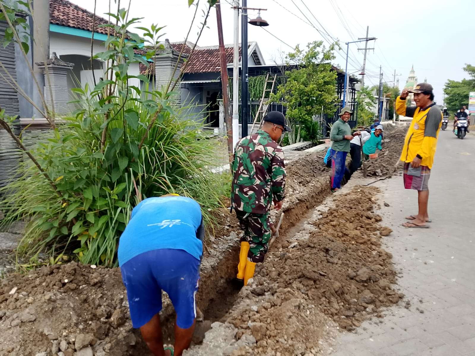 Dengan semangat gotong royong, Babinsa bersama warga bahu-membahu menggali tanah di sisi jalan, merapikan struktur pondasi, serta menyiapkan jalur penahan paving agar lebih kokoh. Kegiatan ini juga bertujuan untuk memastikan konstruksi jalan poros desa dapat digunakan secara maksimal dan memberikan kenyamanan serta keamanan bagi masyarakat dalam beraktivitas.