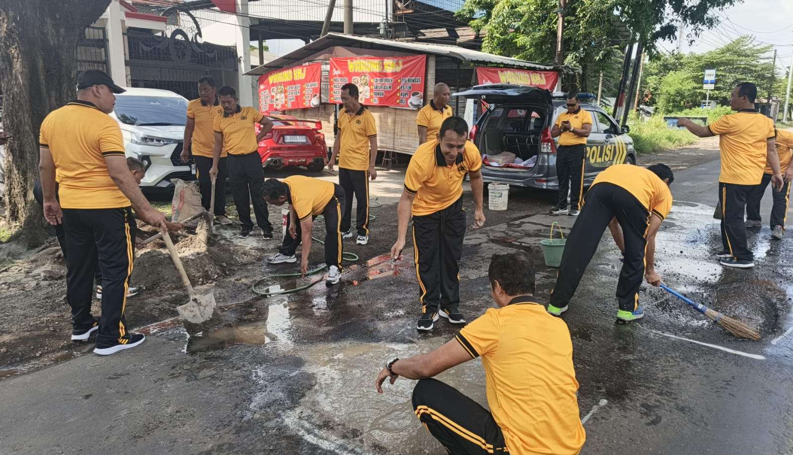 Penambalan jalan dilakukan dengan peralatan dan material seadanya seperti pasir, semen, dan koral. Meski bersifat sementara, kegiatan ini diharapkan dapat mengurangi risiko kecelakaan lalu lintas.