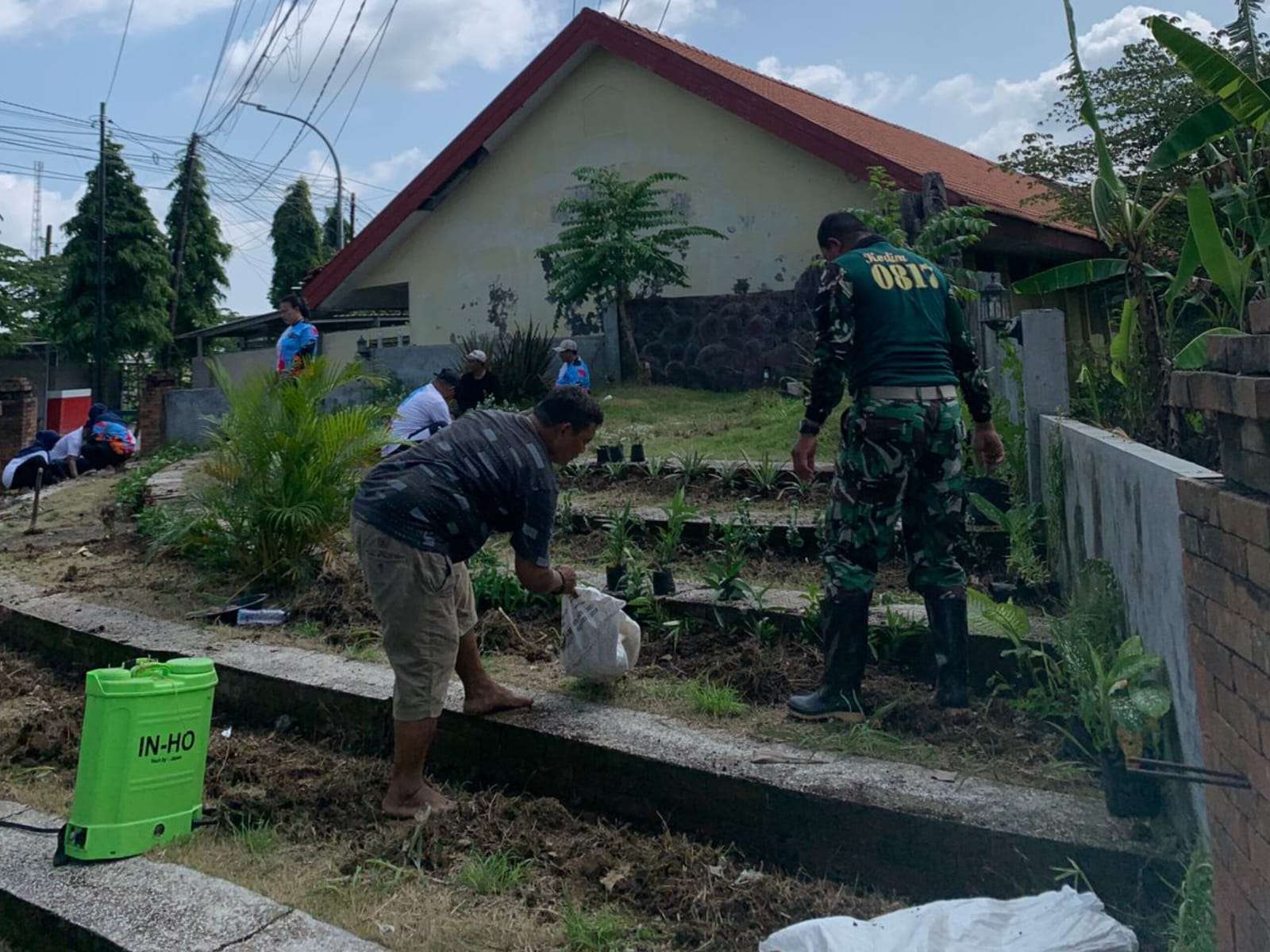 Kegiatan gotong royong tersebut dilakukan dengan membersihkan area halaman kantor desa yang ditumbuhi rumput liar serta merapikan lingkungan sekitar agar terlihat lebih bersih, rapi dan nyaman. Dengan penuh semangat kebersamaan, Babinsa, aparatur desa serta warga bahu-membahu melakukan pembersihan di sekitar area kantor desa.