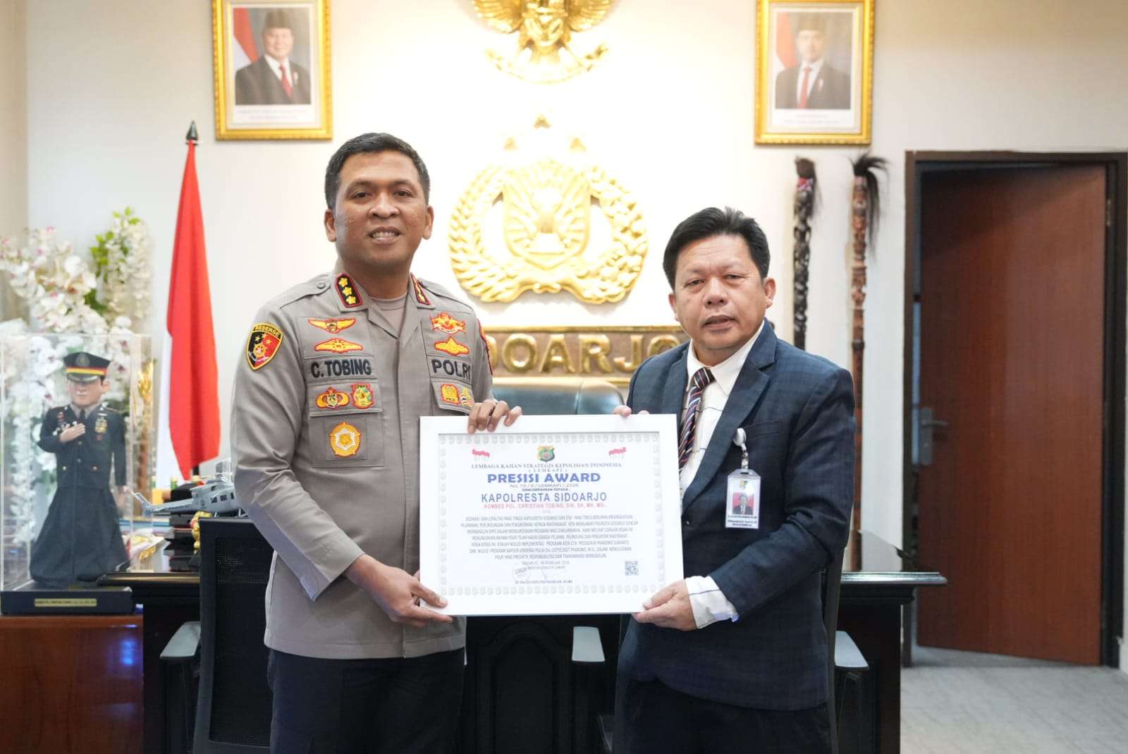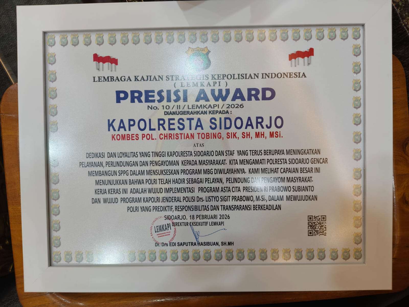 Penghargaan Presisi Award tersebut diberikan Direktur Eksekutif Lemkapi Dr. Edi Saputra Hasibuan kepada Kapolresta Sidoarjo Kombes. Pol. Dr. Christian Tobing, Rabu (18/2/2026) di Mako Polresta Sidoarjo.