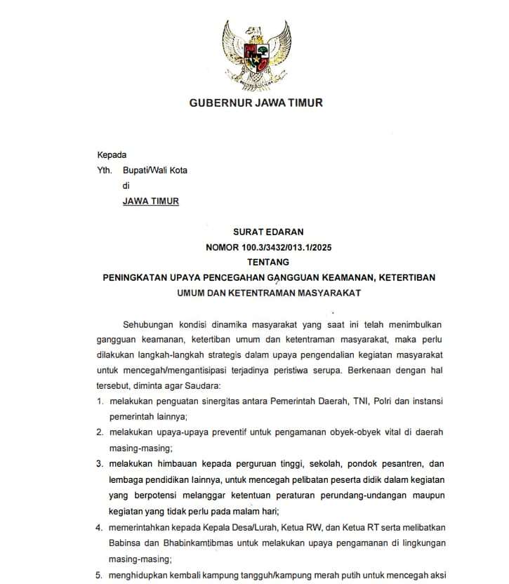 Surabaya, Indonesiajayanews.com – Gubernur Jawa Timur, Khofifah Indar Parawansa, menerbitkan Surat Edaran (SE) Nomor 100.3/3432/013.1/2025, berisi tentang Peningkatan Upaya Pencegahan Gangguan Keamanan, Ketertiban Umum, dan Ketenteraman Masyarakat. SE tersebut diterbitkan untuk mengatur dan menjaga suasana di Jawa Timur dari potensi terjadinya gangguan keamanan dan ketertiban.