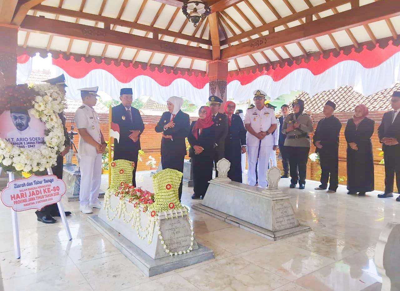 Magetan, Indonesiajayanews.com – Menyongsong peringatan Hari Jadi ke-80 Provinsi Jawa Timur, Kepala Dinas Teritorial (Kadister) Koarmada II Kolonel Laut (P) Andi Susanto, bersama Gubernur Jawa Timur Khofifah Indar Parawansa melaksanakan ziarah ke Makam RMTA Soerjo, Gubernur Pertama Jawa Timur, yang berada di Magetan, Minggu (5/10).