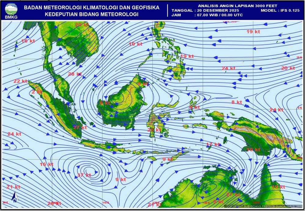 1. Berdasarkan analisis angin gradien 3000 feet tanggal 20 Desember 2025 Jam 07.00 WIB, angin dominan dari arah barat dengan pola pertemuan angin (konvergensi) dan terjadi peningkatan kecepatan angin di wilayah Jawa Timur sebesar 27Knot.