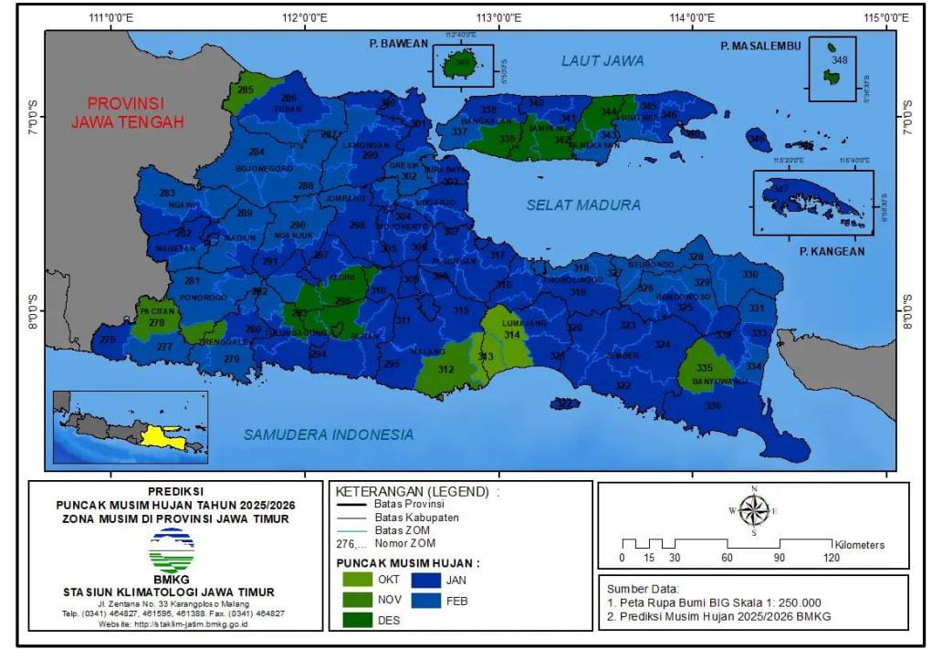 5. Puncak musim hujan di Jawa Timur secara umum diprakirakan pada bulan Januari – Februari 2026 dan ada beberapa wilayah yang puncak musim hujan di bulan Oktober – Desember 2025.