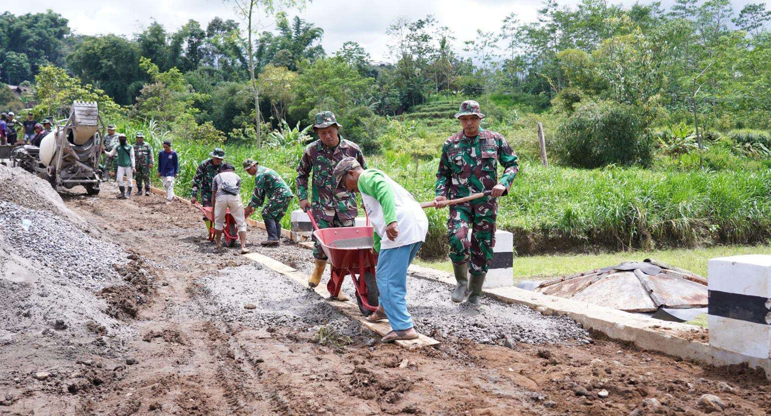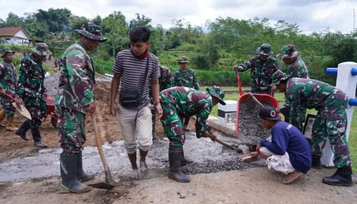 Anggota TNI bersama warga setempat tampak bahu-membahu melaksanakan pengecoran, mulai dari pengangkutan material hingga perataan adukan semen. Semangat gotong royong yang terjalin menunjukkan kuatnya kemanunggalan TNI dan rakyat dalam mendukung percepatan pembangunan di wilayah pedesaan.