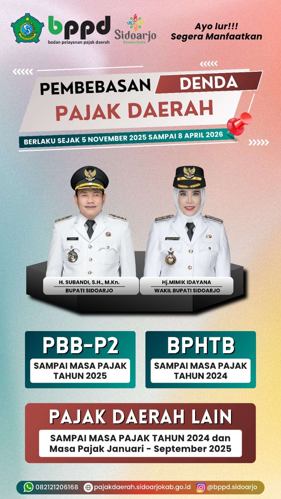 Sidoarjo, Indonesiajayanews.com – Program pembebasan sanksi administratif pajak daerah dilakukan Pemkab Sidoarjo. Program penggratisan denda keterlambatan pembayaran pajak daerah itu telah dimulai 5 November 2025 dan akan berakhir tanggal 8 April 2026. Kebijakan itu untuk mengintensifikasikan pajak daerah dan optimalisasi Pendapatan Asli Daerah/PAD Kabupaten Sidoarjo dari sektor Pajak Daerah,