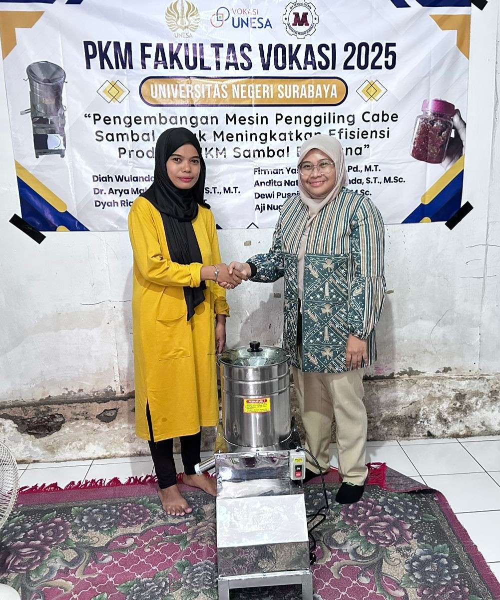 SURABAYA, Indonesiajayanews.com – Sebagai bagian dari komitmen Universitas Negeri Surabaya (Unesa) dalam mendukung kemajuan UMKM lokal, tim Dosen Fakultas Vokasi Unesa mengimplementasikan program Pengabdian kepada Masyarakat (PkM) di UKM Sambal Bu Misna. Program ini bertujuan untuk meningkatkan efisiensi proses produksi sambal dengan mengembangkan mesin penggiling cabe semi-otomatis yang dapat meningkatkan kapasitas produksi secara signifikan.