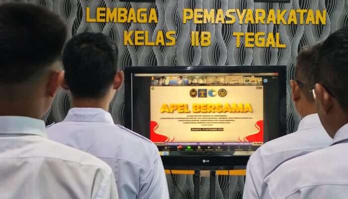 Tegal, Indonesiajayanews.com – Lembaga Pemasyarakatan Kelas IIB Tegal ikuti kegiatan apel bersama jajaran Kementerian Koordinator Bidang Hukum, Hak Asasi Manusia, Imigrasi dan Pemasyarakatan, Kementerian Hukum, Kementerian HAM, dan Kementerian Imigrasi dan Pemasyarakatan yang diselenggarakan secara dari via zoom dan terpusat pada Kantor Kementerian Hukum Republik Indonesia.