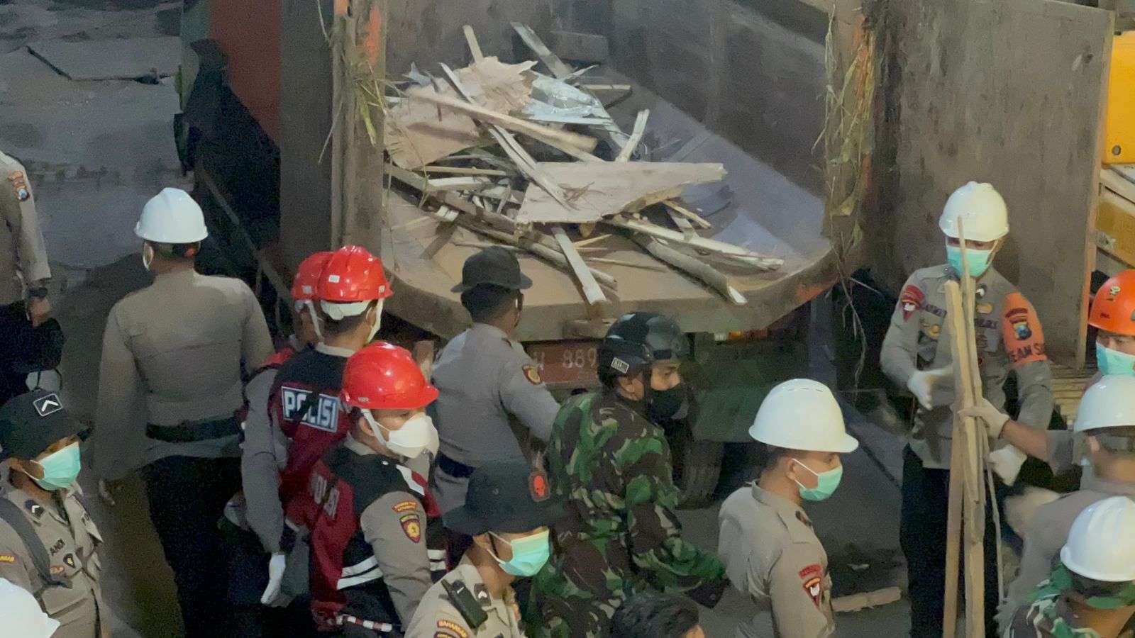 Material bangunan yang ambruk diangkut para personel TNI-Polri untuk kemudian dimasukan ke dalam bak truk. Dengan berhati-hati mereka tampak kompak bersinergi untuk mempercepat dalam proses penemuan korban oleh tim SAR.