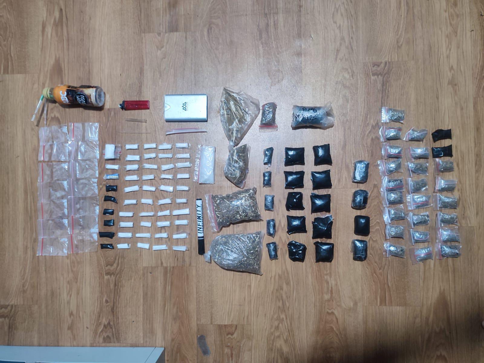 Dari tangan kedua tersangka, Polisi mengamankan sejumlah barang bukti berupa satu alat hisap sabu (AL) beserta pipet, satu timbangan digital, satu pipet kaca, 14 klip sabu, 49 poket sabu, satu klip besar berisi sabu, 45 poket ganja, satu poket besar ganja, tiga plastik besar berisi ganja serta satu plastik berisi batang ganja.