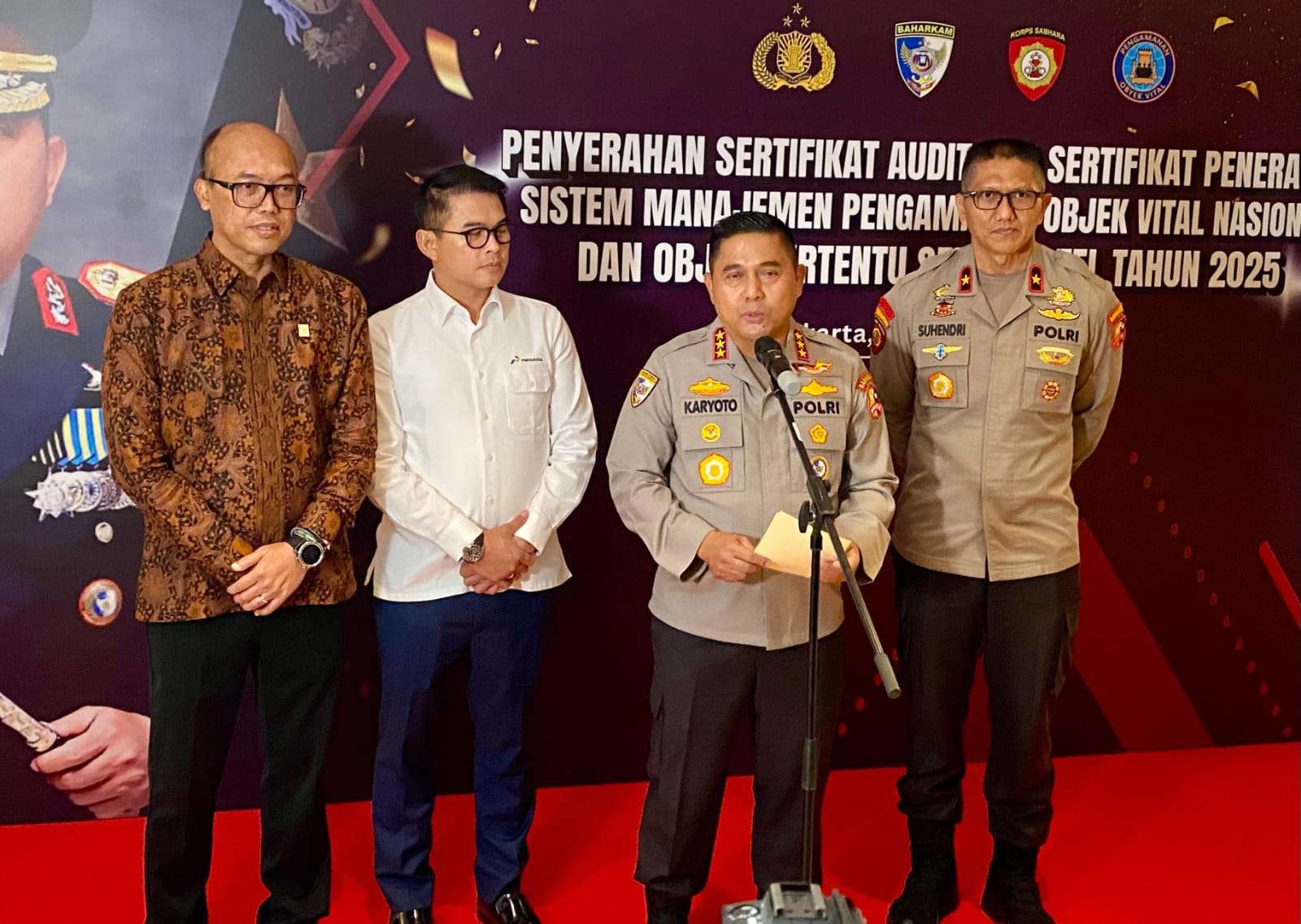 Kabaharkam Polri Komjen Pol. Karyoto, S.I.K., M.H. menjelaskan bahwa audit sistem pengamanan ini bertujuan untuk memberikan penilaian secara objektif dari pihak eksternal, bukan hanya mengandalkan evaluasi internal perusahaan. “Pada hari ini secara simbolis kami menyerahkan sertifikat hasil audit sistem pengamanan kepada beberapa BUMN dan perusahaan-perusahaan yang sudah eksis secara nasional. Maksud dan tujuan audit ini adalah untuk memberikan penilaian dari luar, bukan hanya dari internal,” ujar Komjen Pol. Karyoto.