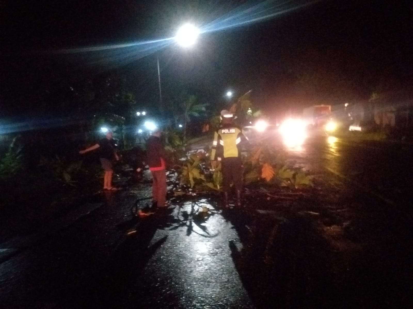 Pohon tumbang sempat menghambat arus lalu lintas dan berpotensi membahayakan pengguna jalan yang melintas di kawasan tersebut.