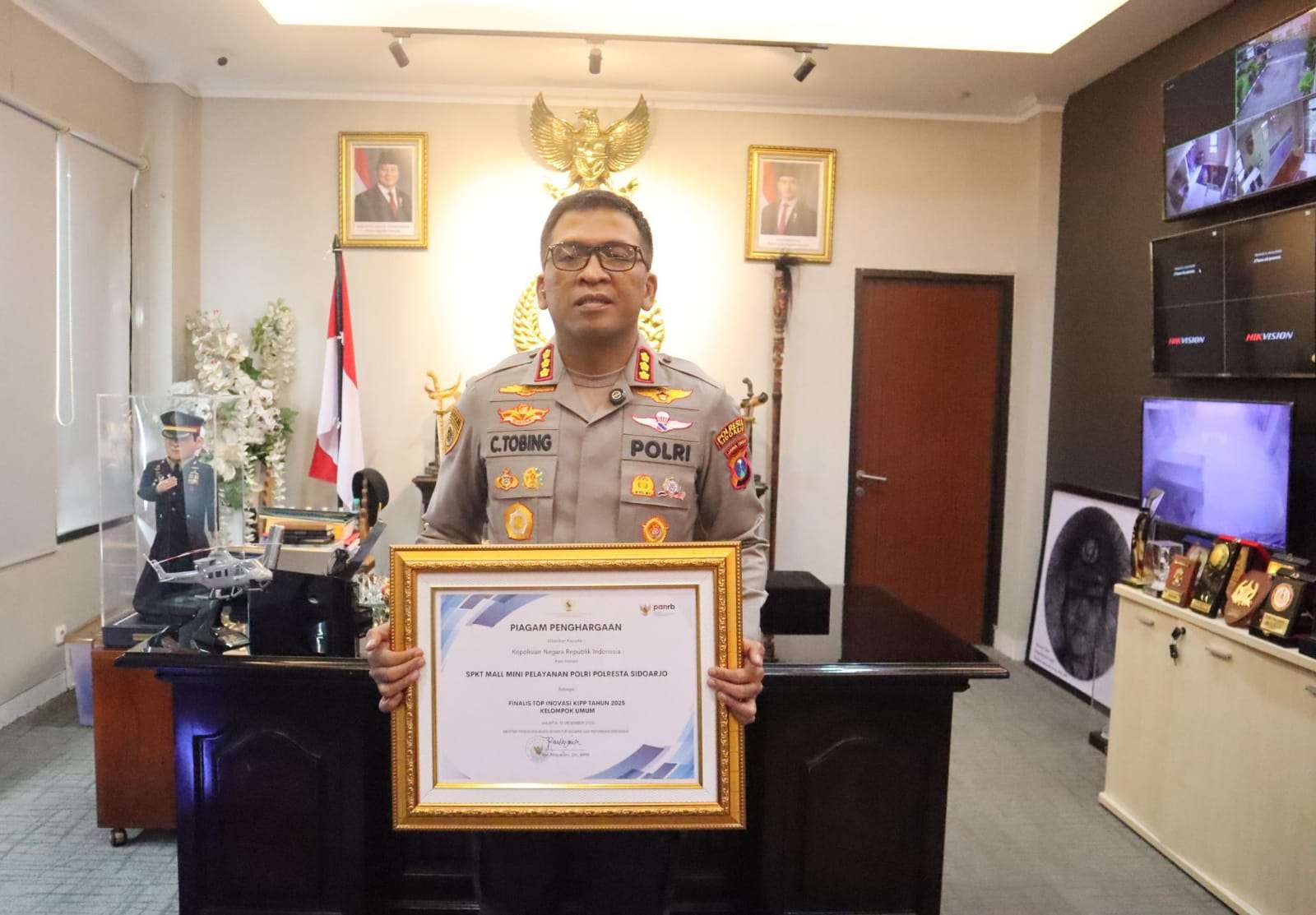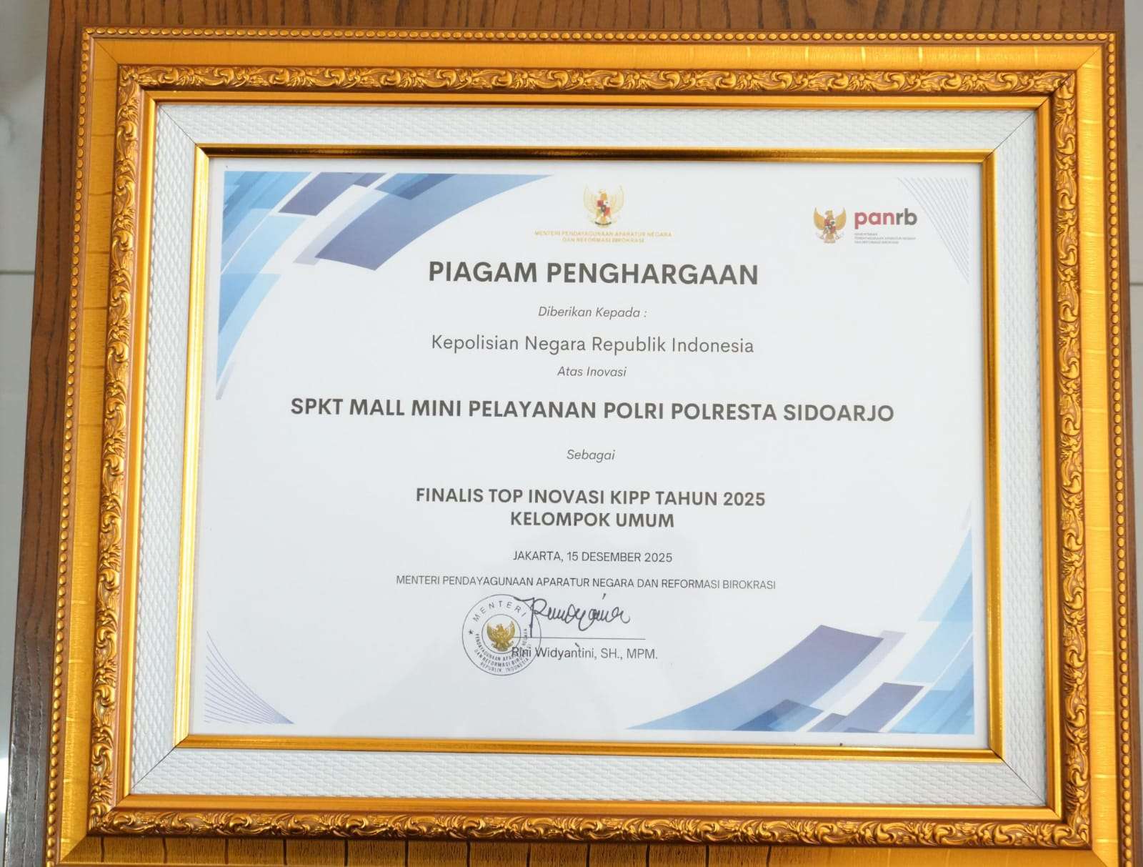 Kapolresta Sidoarjo Kombes. Pol. Christian Tobing, Rabu (14/1/2026), mengucapkan terima kasih atas diberikannya penghargaan dari Menteri PANRB atas inovasi SPKT Mall Mini Pelayanan Polri Polresta Sidoarjo, sebagai Finalis Top Inovasi KIPP tahun 2025 Kelompok Umum.